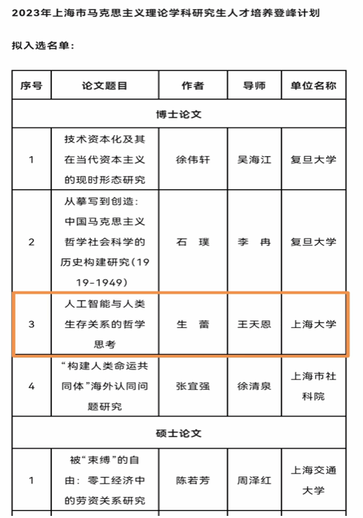 近日,上海市教委公布了“2023年上海市马克思主义理论学科研究生人才培养登峰计划”入选名单,ty8线路测速入口天游ty8线路检测中心登录2018届思想政治教育博士生蕾的博士学位论文《人工智能与人类生存关系的哲学思考》成功入选,论文指导教师为王天恩教授。