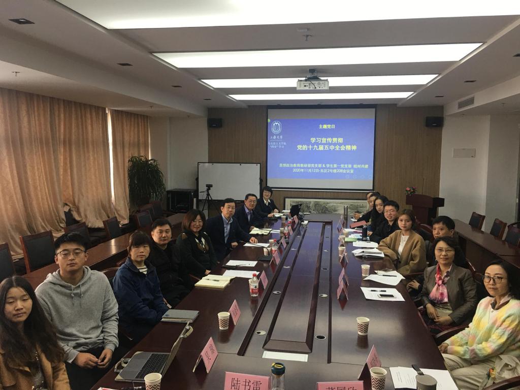 紧接着,杨秀君教授解读了党的十九届五中全会精神。通过回顾决胜全面建成小康社会取得的决定性成就,剖析了我国发展环境面临的深刻复杂变化,到2035年要实现的远景目标,“十四五”时期经济社会发展的主要目标,实现奋斗目标的具体举措等方面进行论述。并指出全党同志只有更加紧密地团结在以习近平同志为核心的党中央周围,在各自岗位上苦干实干、顽强奋斗,一定能战胜“拦路虎”、跨过“绊脚石”,不断推动中国特色社会主义事业大步向前。 随后,参会各位师生党员进行了交流分享。大家纷纷表达了自己对十九届五中全会精神的理解,分享了自己的体悟。 卢吉超表示:两个支部开展结对共建,是强强联合、携手合作共赢的战略举措。期望思想政治教育教研部党支部带领学生第一党支部砥砺拼搏、共创佳绩。 孙士庆指出:基于发展不平衡不充分问题仍然突出的现实考量,全会明确提出以推动高质量发展为主题,对实现高质量发展作出战略部署。坚持“国内大循环为主体、国内国际双循环相互促进”成为我国“十四五规划”和“2035远景目标”的关键政策指引。 陈研心提到:面对国际国内发展的形势,我们要辩证认识和把握国内外大势,认识到错综复杂的国际环境带来的新矛盾新挑战,在党的十九届五中全会精神指引下,我们党员同志发挥好带头作用,善于在危机中育先机、于变局中开新局。焦娇谈到:40多年改革开放的辉煌成就、新中国成立70多年创造的两大奇迹以及中国共产党近百年奋斗的光辉历程,就是十三个五年规划的现实写照,是我们党的初心使命的生动实践。胡孝锴认为:“十三五”胜利在望,“十四五”起步在即。全党要把五中全会精神转化为强大的政治动力和精神动力,以只争朝夕的干劲,奋力书写新时代中国共产党人的优秀答卷。郝玲玲表示:要不断提升学术能力,练就过硬本领,同时锤炼自身的品德修养,做德才兼备知行合一的新时代青年,在学思践悟中坚定自身的理想信念。