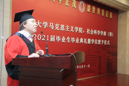 骊歌坦坦,不忘青春年华;山水万程,不负青云之志。2021年7月11日上午10时,ty8线路测速入口天游ty8线路检测中心登录、社会科学学部(筹)2021届毕业生毕业典礼暨学位授予仪式在ty8线路测速入口乐乎楼学海厅隆重举行。ty8线路测速入口党委书记成旦红,天游ty8线路检测中心登录党委书记刘绍学、院长闫坤如等学院领导班子成员,社会科学学部哲学系领导班子成员,陈新汉教授、王天恩教授、欧阳光明教授、宁莉娜教授等近30位导师代表以及2021届本科、硕士、博士毕业生,在校生代表、毕业生亲友参加典礼,典礼由天游ty8线路检测中心登录2019级硕士研究生焦娇担任主持人。 在庄严的歌声中,毕业典礼拉开序幕。天游ty8线路检测中心登录党委副书记张高峰主持嘉宾入场仪式,邀请成旦红书记以及各位领导、导师入场。张高峰逐一介绍到场领导及嘉宾,对成旦红书记以及各位领导、嘉宾的到来表示了热烈的欢迎和衷心的感谢,并且宣布毕业典礼正式开始,全场响起热烈掌声,大家齐唱国歌,共同开启这庄严神圣的时刻。 骊歌奏响,难忘来时岁月 在热烈的氛围中,大家观看了短片《钱伟长校长毕业赠言》。短片中,钱伟长校长以恳切真挚的语言表达了对毕业学子的殷切期盼,希望同学们成长为一个全面发展的人,以“自强不息,先天下之忧而忧,后天下之乐而乐”的校训鼓励大家要成为一个对祖国、对社会有所贡献之人,大家备受鼓舞。