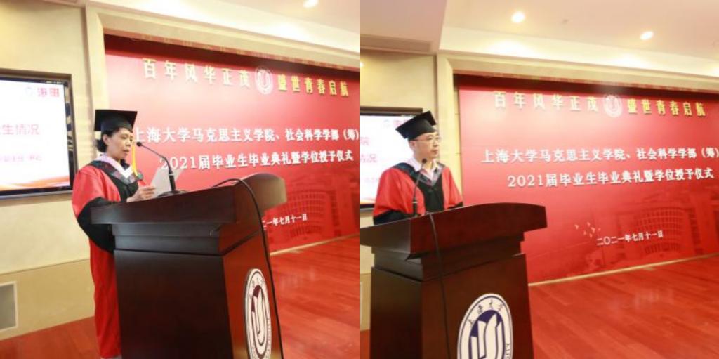 光阴数载,道不尽院、部温柔;二十而志,当接续砥砺奋斗。离别之际,毕业生们饱含对学院、对老师的感恩之情,表达了“把论文写在祖国大地、用实干投身四海神州”的壮志豪情。2021届哲学专业本科毕业生、上海市优秀毕业生刘珂然发言,她回顾了与老师开放探讨学术问题、与同学并肩学习奋斗的四年大学生活,她说自己不仅获得了自身的成长,还见证了学校的发展。她认为哲学对她来说是一片广阔深邃的海,包容并支撑着她全部的生活,哲学是拨动在生活胸腔里的心脏,充满无限可能,由此表达了对哲学的无限热爱。她说,她的成长得益于学校、学部的培育,离不开老师、同学的帮助与关怀,她向学校、学部表达了最诚挚的感谢和最美好的祝福。