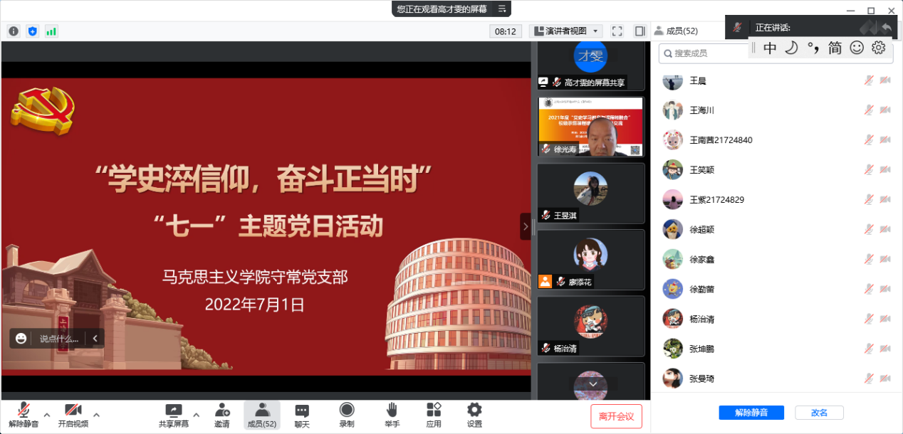 2022年7月1日上午9时,ty8线路测速入口天游ty8线路检测中心登录守常党支部开展“学史淬信仰,奋斗正当时”七一主题党日活动,活动旨在促进支部成员学习守常先生建党思想,继承和弘扬先辈遗志,弘扬伟大建党精神,充分发挥马院学子的使命担当。本次活动由守常党支部书记高才雯主持。