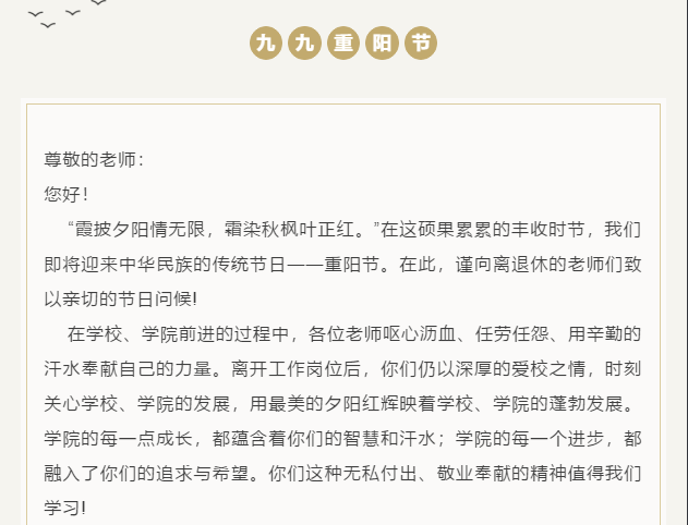 “霞披夕阳情无限,霜染秋枫叶正红”。又是一年重阳节来临之际,结合目前疫情防控形势和学校的相关要求,天游ty8线路检测中心登录采取了多种形式,灵活开展敬老节相关活动,以弘扬尊老敬老、爱老助老的中华民族传统美德,表达对离退休老教师的关爱和感激之情。 学院坚持为老教师们办实事、做好事、解难事,保障敬老补贴1:1配备到位,同时对于高龄、重病老教师,学院配备了专门慰问金。学院还给每位老教师发放了一封慰问信,感谢老教师们曾为学院发展做出的贡献,也传递了学院对老同志的关心和关怀。