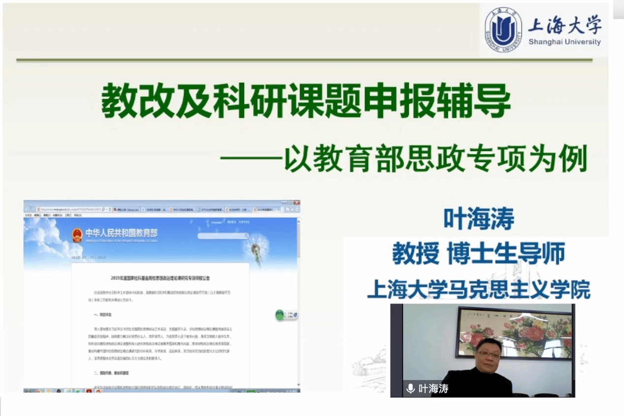 近期,全国高校正在组织申报各类国家级与省部级的科研、教改和教研项目,ty8线路测速入口文科处已相继发布《2023年度教育部人文社会科学研究一般项目申报工作的通知》、《关于2023年度高校思想政治理论课教师研究专项一般项目申报工作的通知》等多项公告,要求相关院系的教师申请人根据自身的研究基础和教学特长,坚持正确政治方向、价值取向、研究导向,认真凝练主题,积极参与申报。为进一步推动学院相关课题申报工作的顺利展开,提高青年教师课题申报的技巧与方法,学院青年教师联合会(青联会)4月1日上午特邀天游ty8线路检测中心登录主持工作副院长叶海涛教授在学院502会议室作专题报告,各位青年教师采取线上(腾讯会议)与线下相结合的方式参加了此次培训活动。 叶海涛教授通过“教改及科研课题申报辅导——以教育部思政专项为例”的报告,为学院青年教师详细讲解了教改与教研课题申报概述、思政专项课题类别、教育部思政教师专项申报,以及课题申报过程中需要注意的事项和细节。首先,通过概述教改与教研课题的申报环节,叶海涛教授列举了科研、教改和教研项目中的三个典型案例,着重强调了不同课题项目的侧重点与落脚点。然后,基于思政专项课题的要求,叶海涛教授全面解析了“2020年度高校思想政治理论课教师研究专项”的立项情况,并且结合今年的申报工作通知进一步剖析了四类高校思政课项目的申报难度、课题特点以及注意事项。最后,关于教育部思政教师专项申报,叶海涛教授要求申报者仔细阅读《申报通知》与《课题指南》,认真填写《申报书》与《活页》,熟悉整体设计,做到心中有数。 叶海涛教授的报告结束后,学院广大青年教师于线上和线下积极提问,针对课题项目申报中遇到的各种问题深入交流,并且纷纷表示在此次专题培训活动中受益匪浅,感谢叶海涛教授能将自身经验倾囊相授。学院青联会也将以此次专题培训活动为契机,努力解决青年教师在科研与教学上的迷思、困惑和难题,奋力加快青年教师在学院各项工作中的进步和成长。