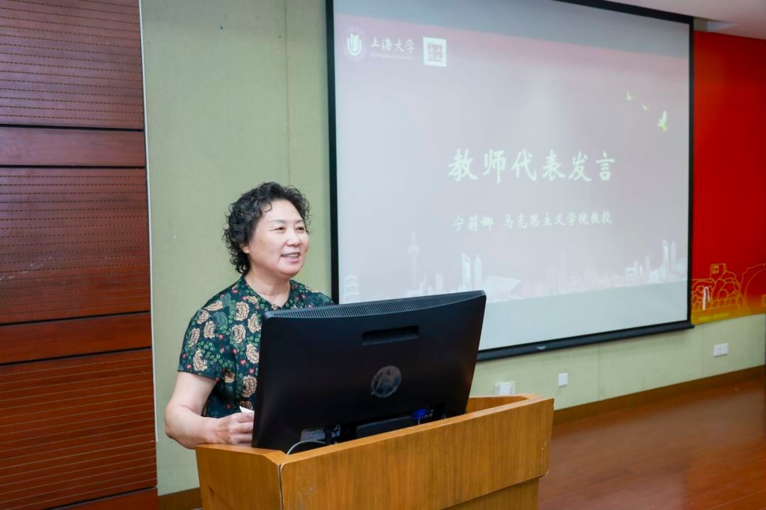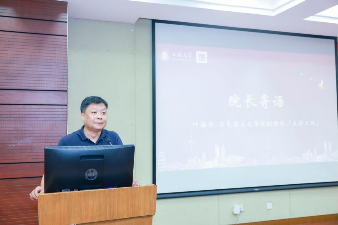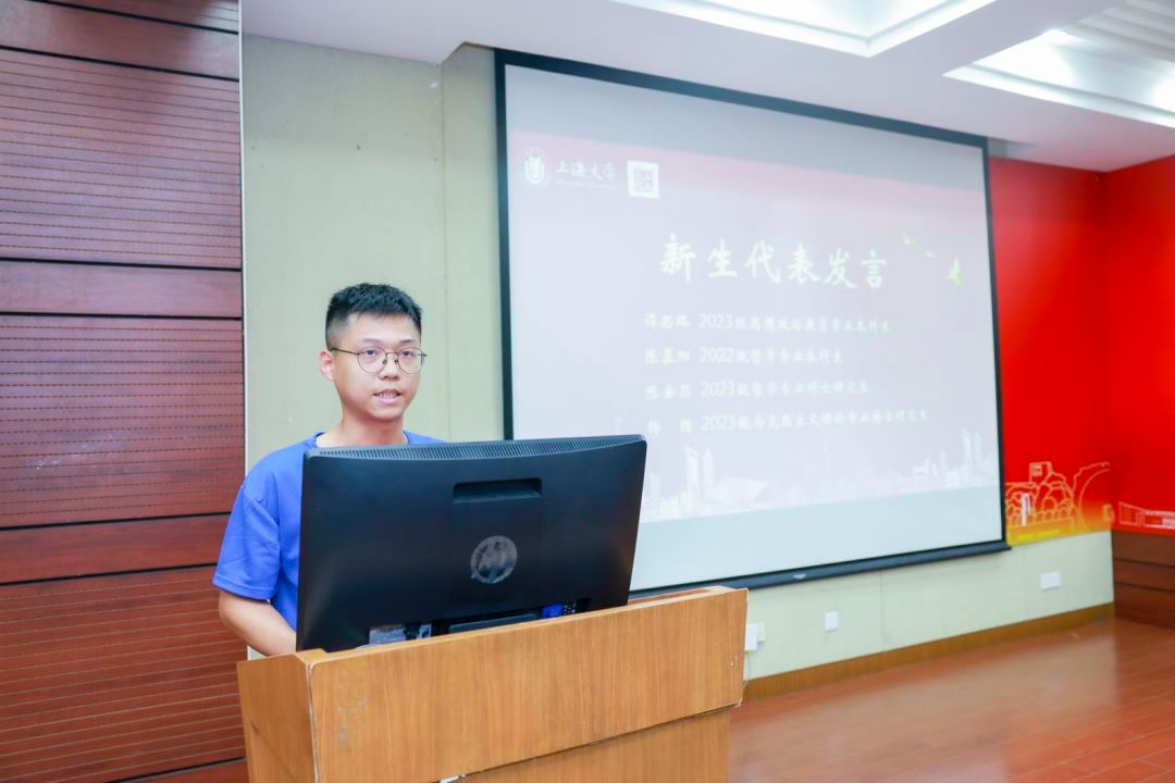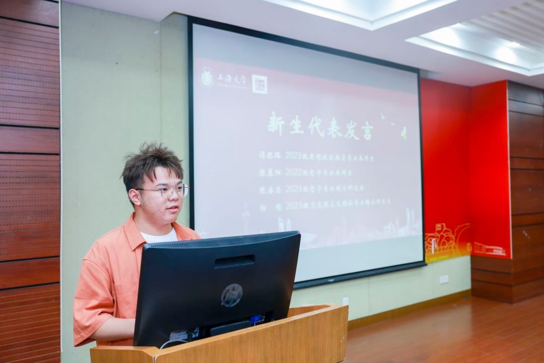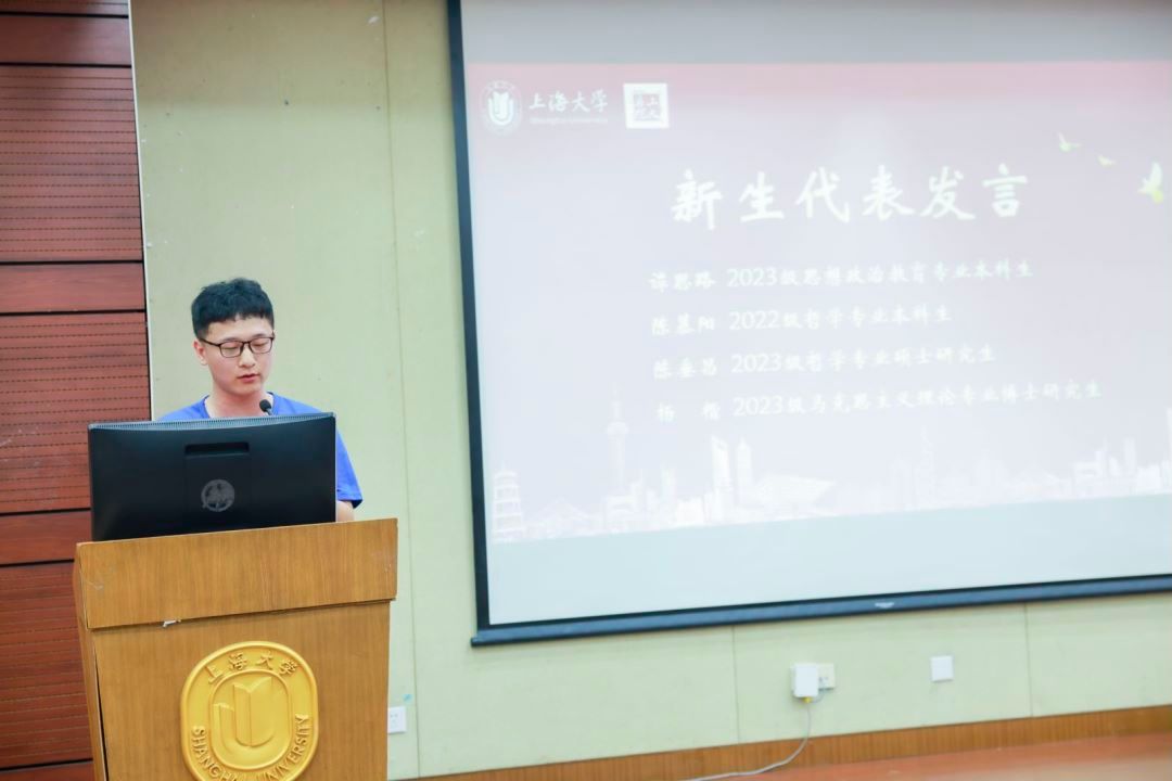 随后,2023级思想政治教育专业本科生谭思路、2022级哲学专业本科生陈慕阳、2023级哲学专业硕士研究生陈垂昌、2023级马克思主义理论专业博士研究生杨楷分别作新生代表发言。谭思路从自身对上海的热爱以及被上大深厚的红色基因所吸引表达了对自己将来所要学习的知识的憧憬。陈慕阳认为迷茫与不安中,思考与相信的力量是最稀缺的品质,因而这也是她选择马院的重要原因。陈垂昌则从他与哲学的故事源起谈到,他说“哲学不仅改变了我,更切实地在改变这个世界,希望未来同学们都要更加从容地面对自己、面对家庭、面对社会、面对人生。”杨楷从自己撰写的第一篇学术论文谈起,与大家共勉:在研究生期间要多阅读、多思考、理论联系实际,勇于创新。
