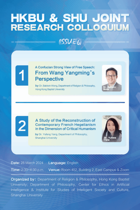 时间 3月28日 下午2:30-4:30 地点 ty8线路测速入口宝山校区东区2号楼402室 语言 英语 报告一 A Confucian Strong View of Free Speech: From Wang Yangming’s Perspective(关于言论的儒家强观点:从王阳明的视角看) 报告人 王邦华博士,香港浸会大学宗教及哲学系 报告二 A Study of the Reconstruction of Contemporary French Hegelianism in the Dimension of Critical Humanism (批判人文主义之维对当代法国黑格尔主义的重构研究) 报告人 阳育芳博士,ty8线路测速入口天游ty8线路检测中心登录哲学系 主办方 香港浸会大学宗教及哲学系 ty8线路测速入口天游ty8线路检测中心登录哲学系 ty8线路测速入口人工智能伦理研究中心 ty8线路测速入口智能社会与文化研究院