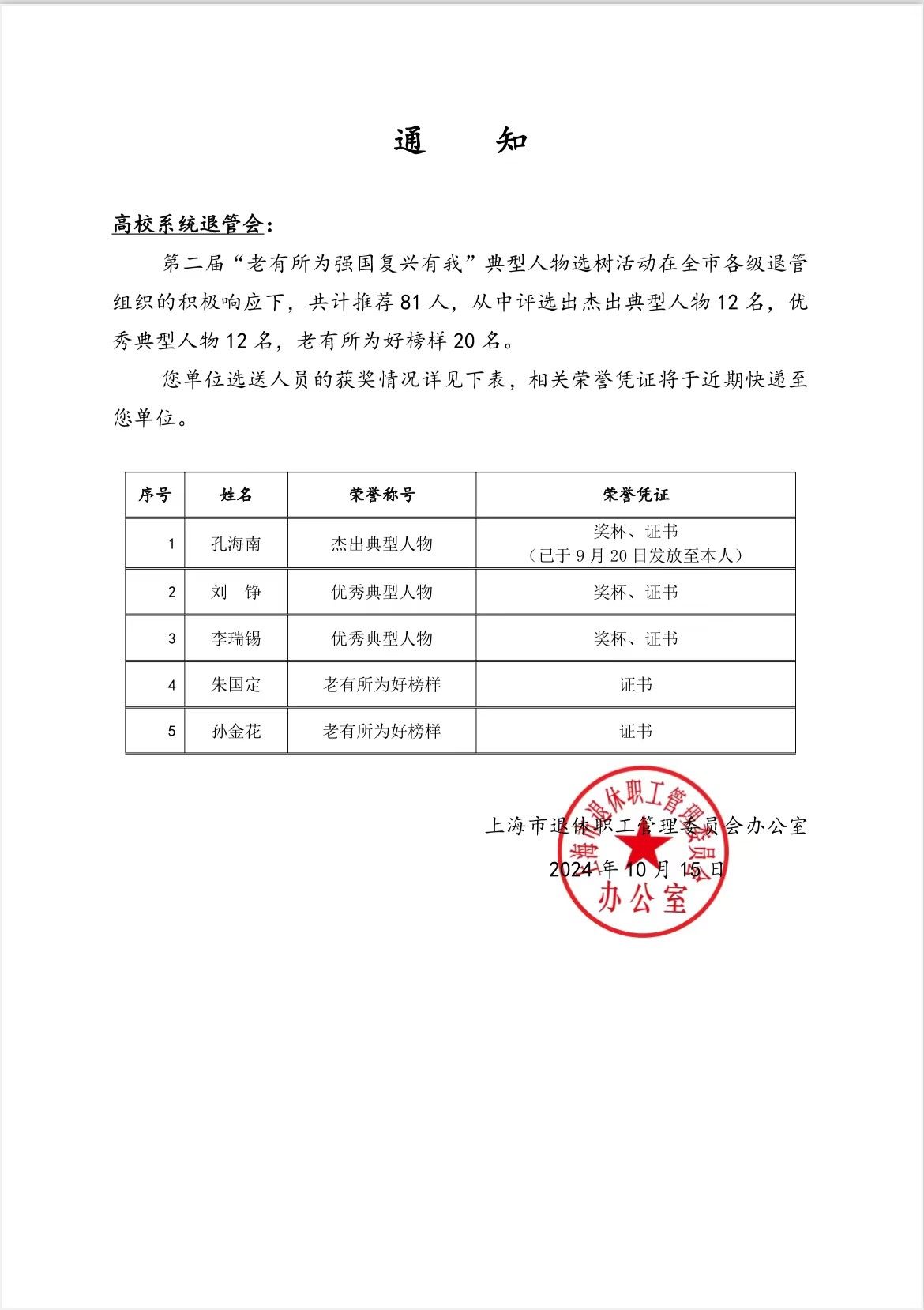 近日,上海市第二届“老有所为 强国复兴有我”典型人物选树名单揭晓。经全市各级退管组织的积极组织推荐、上海市退休职工管理委员会办公室评选,我校天游ty8线路检测中心登录退休教师刘铮教授经由学校离退休工作处推荐在此评选中获得“‘老有所为 强国复兴有我’优秀典型人物”荣誉称号!
